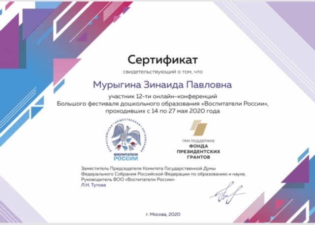 Участник 12-ти онлайн-конференций "Воспитатели России" 2020г. |