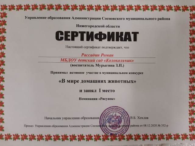 Победитель муниципального конкурса "В мире домашних животных" 2020г. |