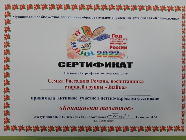 Сертификат участия в детско-взрослом фестивале "Континент талантов" |