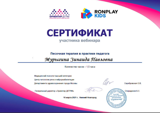 Участник вебинара "Песочная терапия в практике педагога" 2021г. |