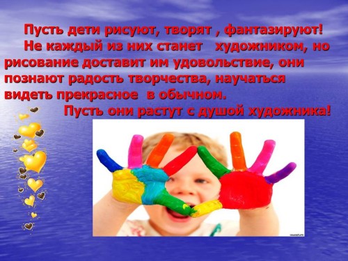 Каждый ребенок, познавая окружающий мир, старается отразить его в своей деятельности: в игре, в рассказах, в рисовании, в лепке и т.д. Прекрасные возможности в этом отношении представляет изобразительная творческая деятельность. Чем разнообразнее будут условия, способствующие формированию творческой среды, тем ярче станут проявляться художественные способности ребенка.