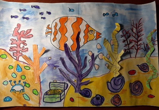 Посмотрев видео по теме нашего урока мы изобразили вот такой подводный мир с различными рыбками и водорослями, а на самом дне лежит сундук с сокровищами.